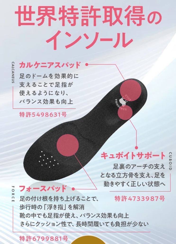 足裏のアーチを支える3つの世界特許技術*1が美しい姿勢の土台作りをサポート。