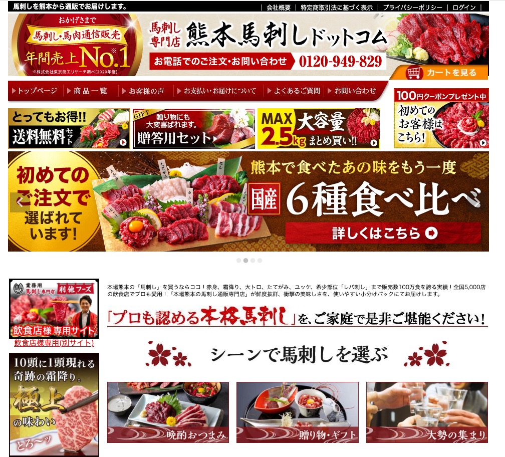 熊本馬刺しドットコムは、馬刺し・馬肉の通信販売で年間売上No.1の実績を誇る専門店です。